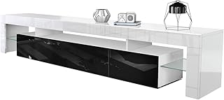 Vladon Meuble TV Bas Lima V2, Corps en Noir/Façades en Blanc Haute Brillance