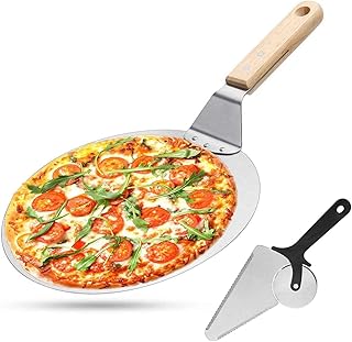 Yebobo Kit de Pelle à Pizza en Acier Inoxydable et Pelle à Pizza de 12 Pouces, Palette de Pizza Ronde en MéTal avec Manche en Bois, Spatule à Pizza