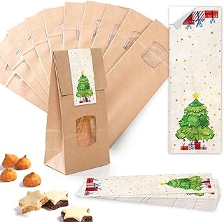 Lot de 50 petits sacs en papier kraft marron avec fond pour fenêtre - 10 x 6,5 x 27,5 cm - Avec 50 autocollants - Rouge/vert/beige - Motif arbre de Noël