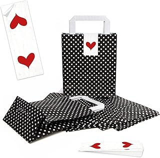 Lot de 10 petits sacs en papier noir et blanc avec anse en papier cadeau 18 x 8 x 22 cm + autocollant en forme de cœur rouge